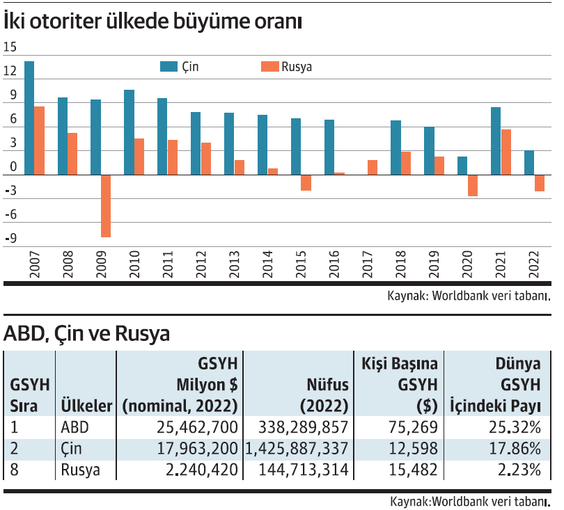 Çin, 2022 yılı sona erdiğinde 1 milyar 425 milyon nüfusu ile dünyanın en kalabalık ülkesi olurken 338 milyon 289 bin kişi ile ABD üçüncü sırada yer aldı (Hindistan 1 milyar 412 milyon ile ikinci sırada). Çin, 17 trilyon 963 milyar dolar ile ABD’nin ardından en yüksek GSYH’ye sahip ikinci ülke iken Rusya 2 trilyon 240 milyar dolar ile sekizinci sırada. Çin ve Rusya’yı ABD’den ayıran en temel olgu yönetim sistemi. Kâğıt üzerinde her üç ülkede başkanlık sistemi ile idare edilmekte. Ancak Çin ve Rusya otoriter bir başkanlık sistemine sahip. Bu yazıda Çin ekonomisi üzerinde duracağız.