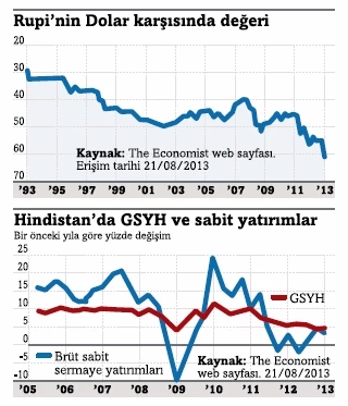 Hindistan Rupi’si yıl başında ABD doları karşısında 42,1 iken, 22 Ağustos’ta 64,8’e kadar geriledi. FED’in parasal genişlemeyi sona erdireceğine yönelik söylentilerin başladığından bu yana Rupi ABD doları karşısında yüzde 17 değer yitirdi. Rupi değer kaybederken, sermaye kontrolü olmasına rağmen son iki aydır Hindistan’dan sermaye çıkışı hızlandı. Haziran başından bu yana uluslararası yatırımcıların Hindistan’dan çektiği para 11,5 milyar dolara ulaştı. Hindistan’da 2011 yılından itibaren büyüme oranı ve sabit sermaye yatırımları düşüyor. Son iki ay ki gelişmelerle ile birlikte bu düşüşün güçlenerek devam edeceği görülüyor. Özetle Hindistan ekonomisi krize girmek üzere.